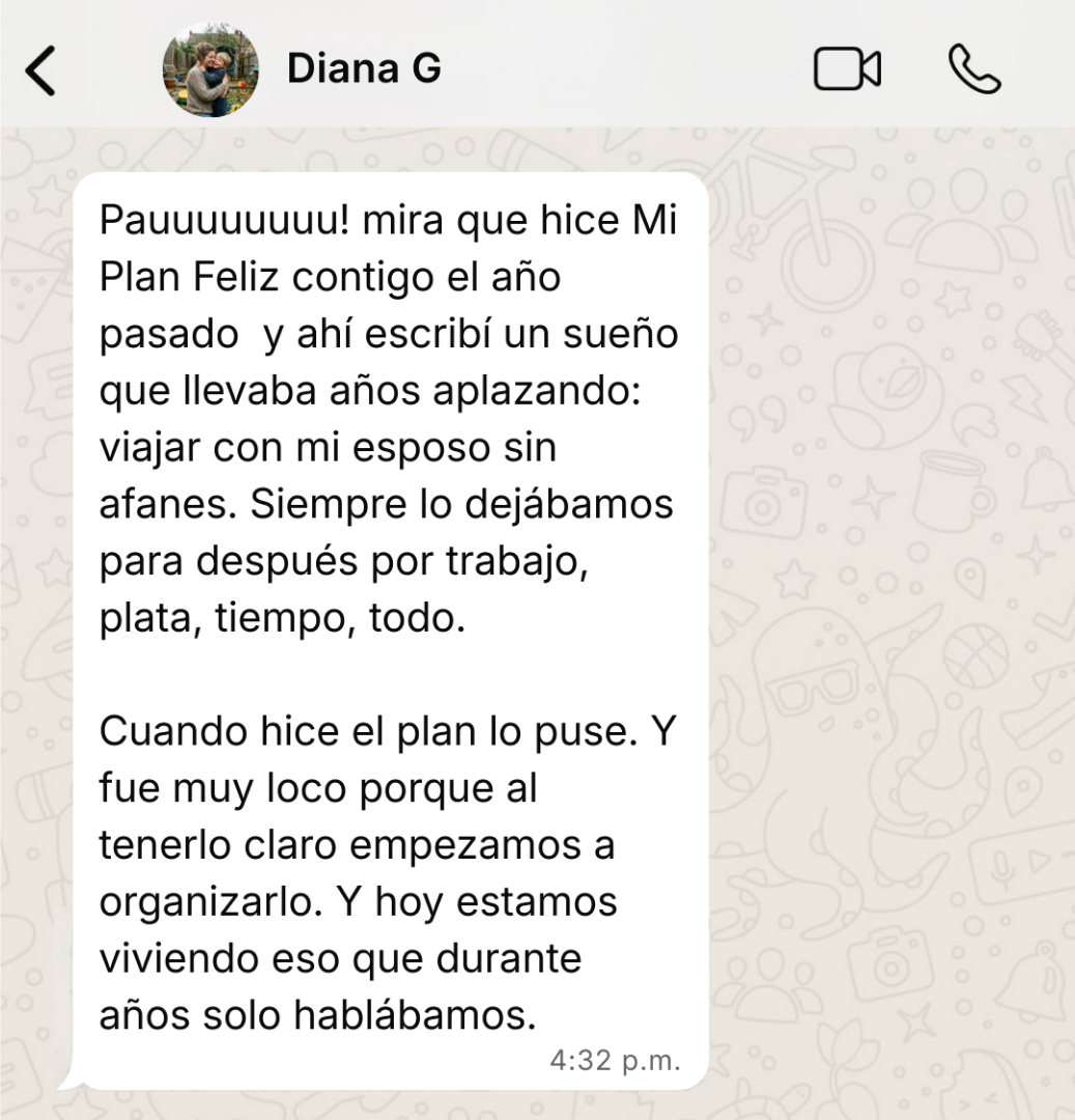 Quería pasar por acá a darte las gracias por crear este bootcamp tan ameno y facil de aplicar para poder aterrizar nuestros sueños y hacerlos realidad; quede super motivada a seguir planeando mi día a día ya q esto es la base fundamental para lograr las metas grandes y aprovechar al máximo mi tiempo. No veo la hora de empezar el curso de mi vida en orden.