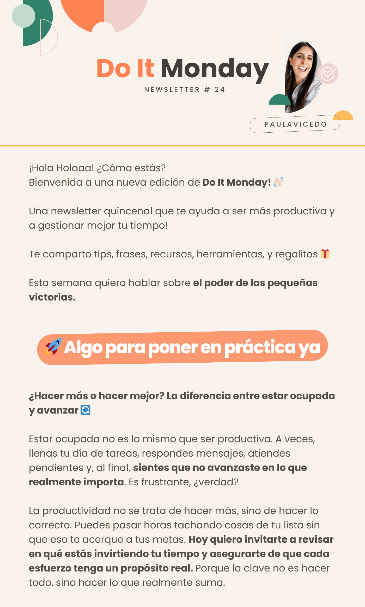 Do It Monday es una newsletter quincenal que te ayuda a ser más productiva y a gestionar mejor tu tiempo! En ella te comparto tips, frases, recursos, herramientas, y regalitos 🎁