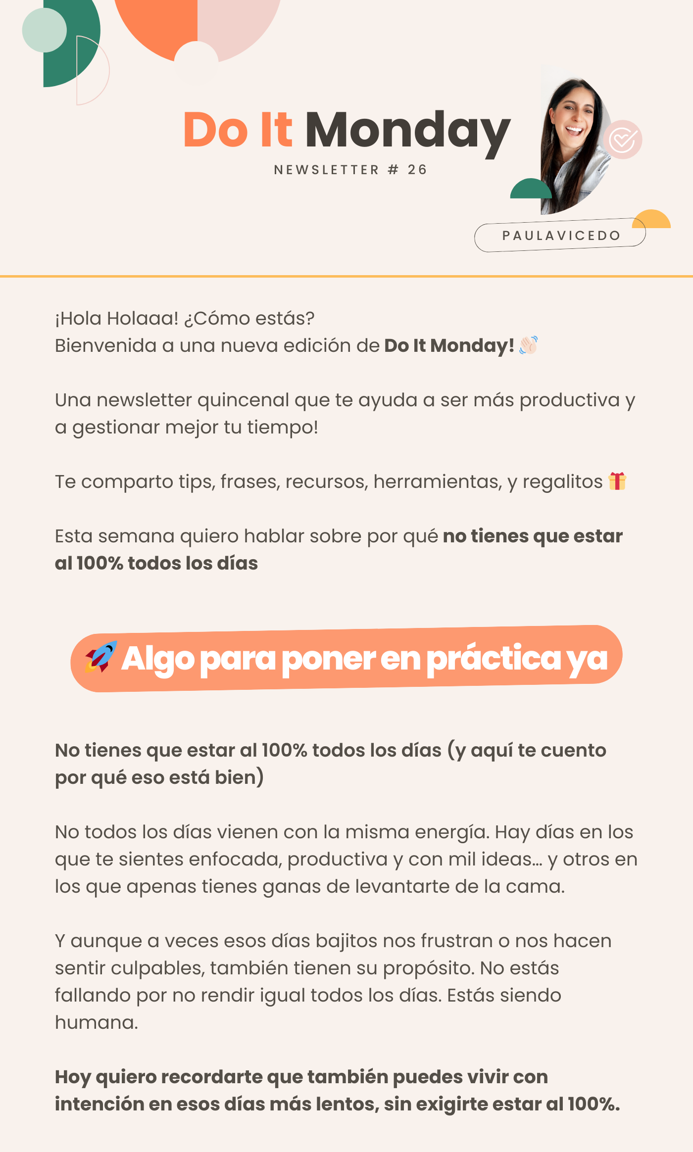 Do It Monday es una newsletter quincenal que te ayuda a ser más productiva y a gestionar mejor tu tiempo! En ella te comparto tips, frases, recursos, herramientas, y regalitos 🎁