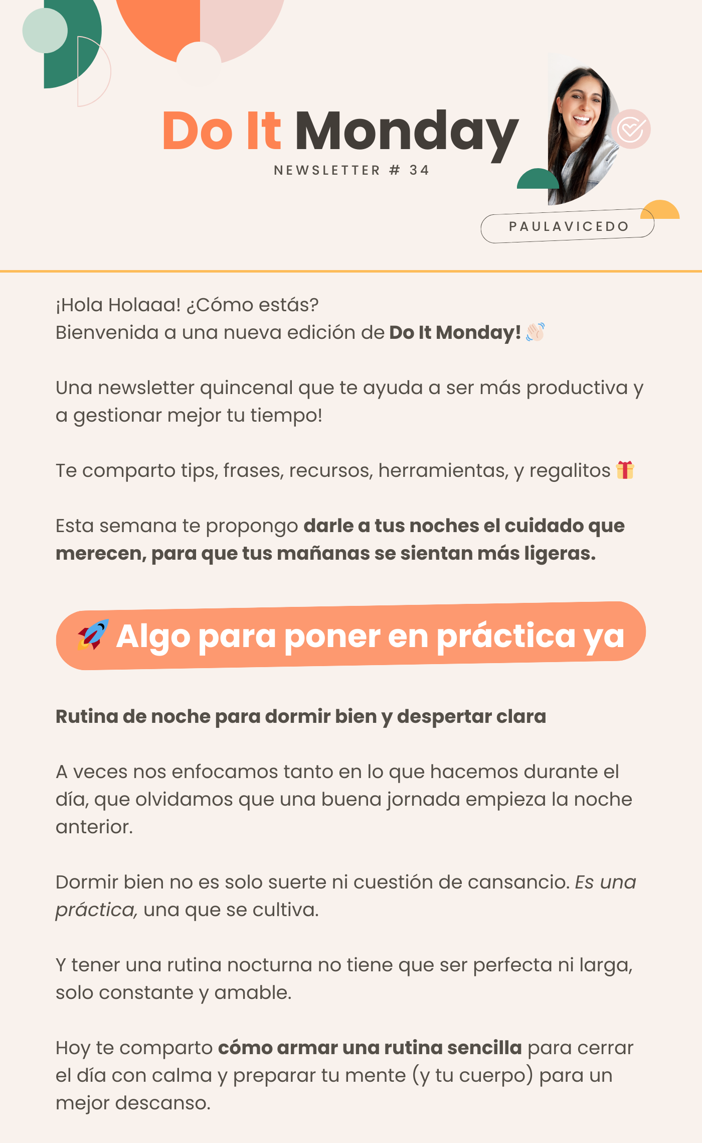 Do It Monday es una newsletter quincenal que te ayuda a ser más productiva y a gestionar mejor tu tiempo! En ella te comparto tips, frases, recursos, herramientas, y regalitos 🎁