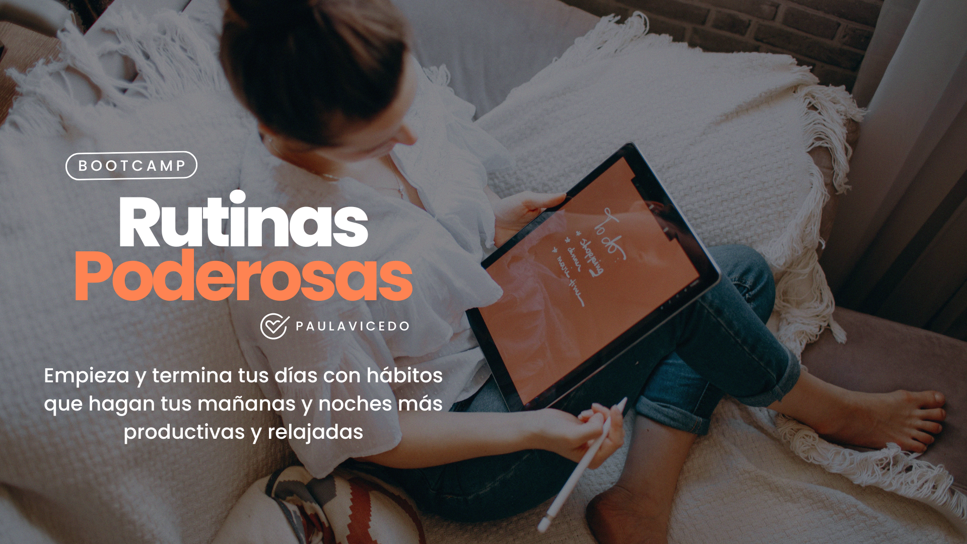 Te invito a unirte a Rutinas Poderosas! Un BootCamp EN VIVO, dónde aprenderás a crear e integrar hábitos y rutinas, en tus mañanas y noches, para comenzar y cerrar tus días con más calma, claridad y control.