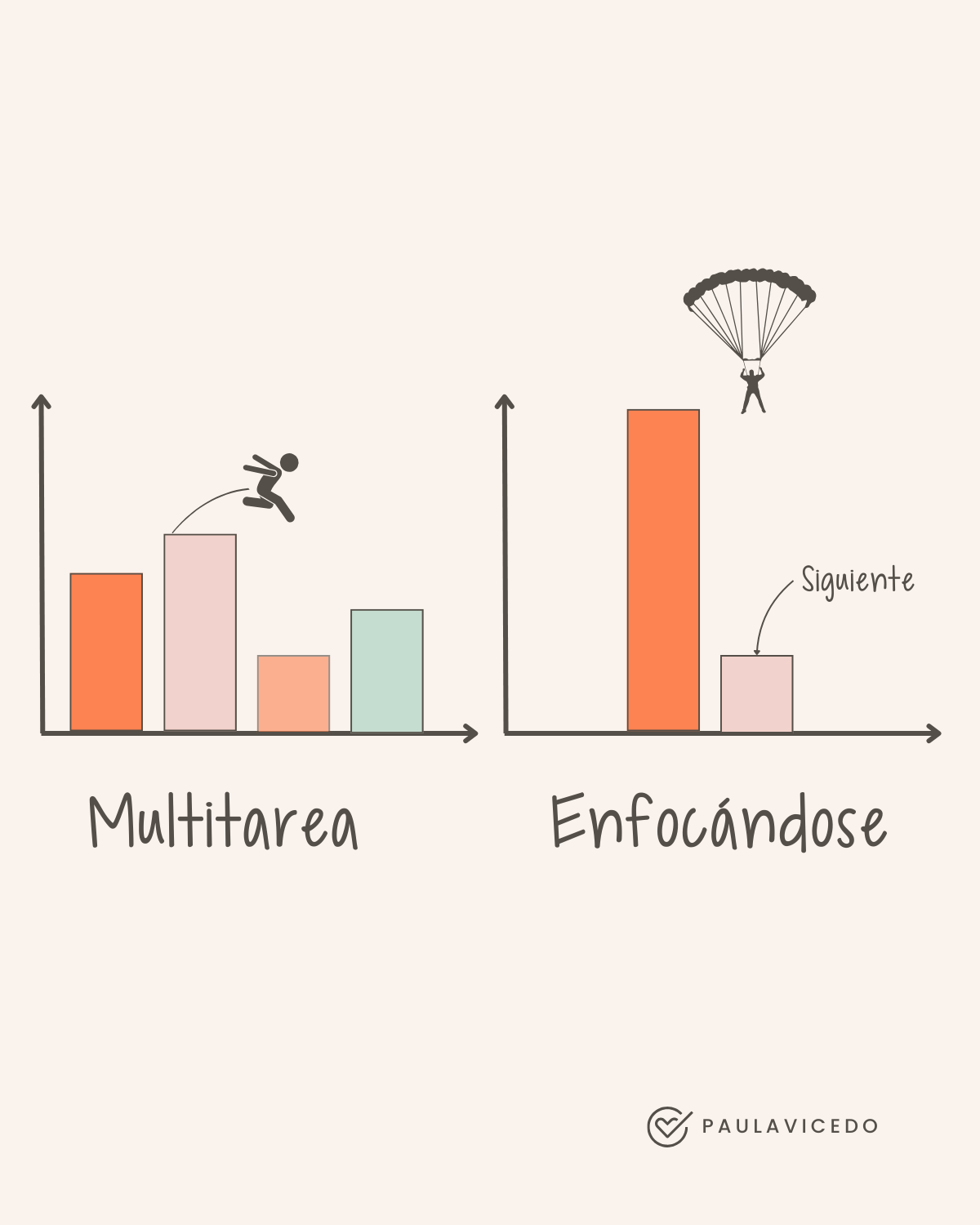 Cuando haces multitarea, cambias de una tarea a otra sin terminar completamente ninguna de manera eficiente. Esto hace que avances poco en cada tarea y no logres un resultado satisfactorio. En cambio, cuando te enfocas en una tarea a la vez y la completas antes de pasar a la siguiente, eres más productiva. Así, puedes avanzar más en cada tarea y obtener mejores resultados.